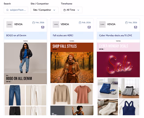 Google and Meta ads, email campaigns, social posts, and promotions tracked automatically. Filter by channel, competitor, and date.