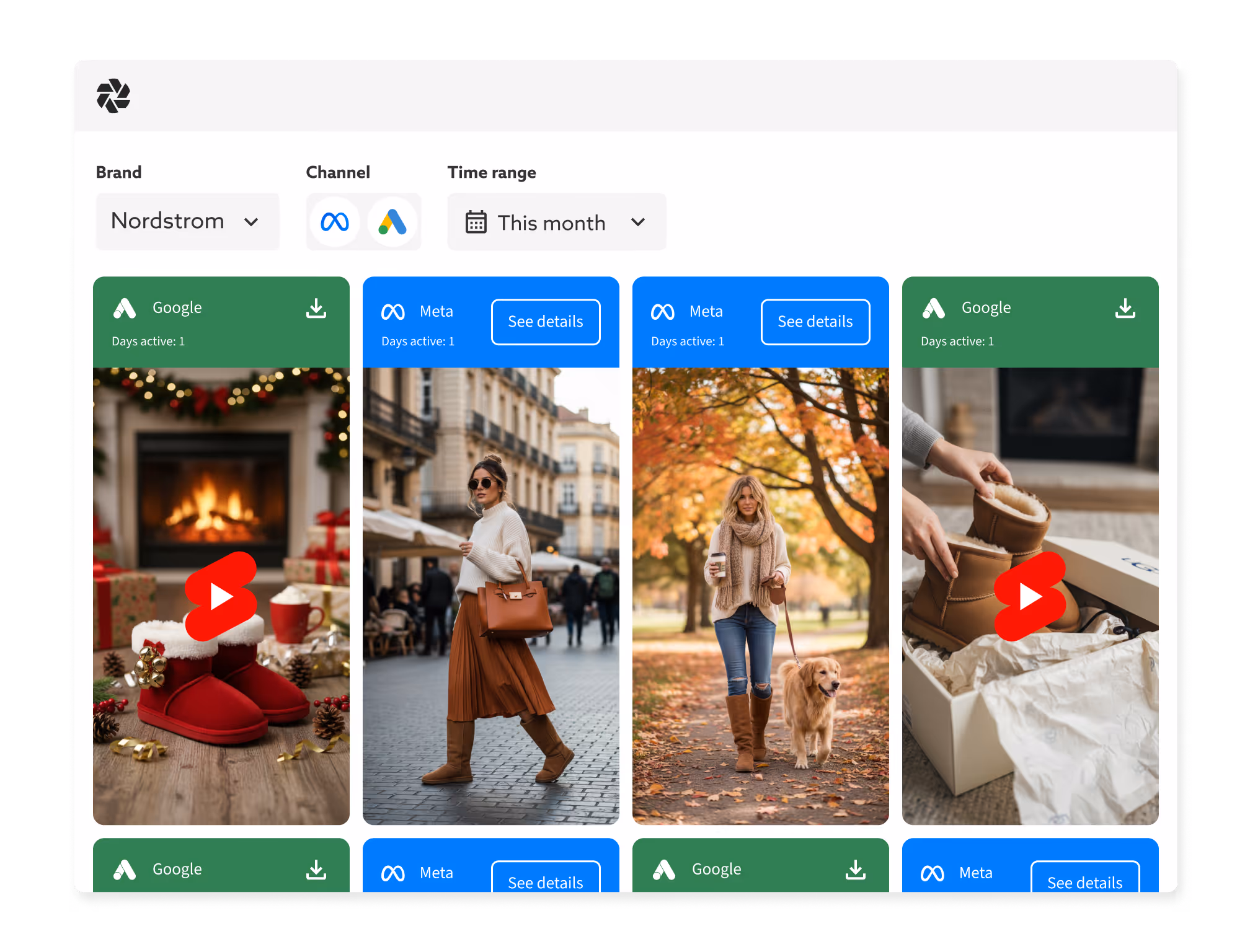 Google and Meta ads, email campaigns, social posts, and promotions tracked automatically. Filter by channel, competitor, and date.